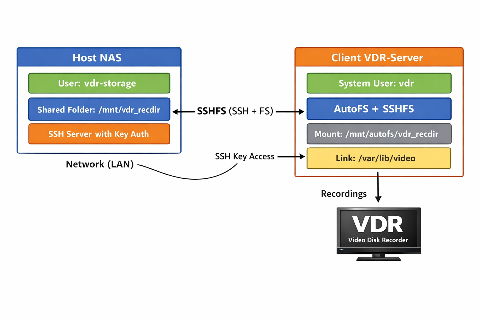 Der VDR-User auf einem Client-System kann seine Aufnahmen direkt auf einem entfernten Storage-Server ablegen, ohne dass eine Passworteingabe erforderlich ist. Auf dem Host-System werden hierfür zunächst die erforderlichen Benutzerkonten sowie die Verzeichnisse mit den korrekten Besitz- und Zugriffsrechten erstellt. Anschließend wird der SSH-Zugang für den VDR-User eingerichtet, inklusive einer Schlüssel-basierten Authentifizierung, um eine sichere, passwortlose Verbindung zu ermöglichen. Auf dem Client wird Autofs in Verbindung mit SSHFS konfiguriert, sodass das Videoverzeichnis des VDR automatisch auf den entfernten Speicher gemountet wird. Dadurch kann der VDR-Dienst seine Aufnahmen direkt auf dem Storage-Server ablegen. Die Schreibrechte sind dabei ausschließlich dem VDR-User zugewiesen, während andere Benutzer nur lesenden Zugriff erhalten, sofern erforderlich.