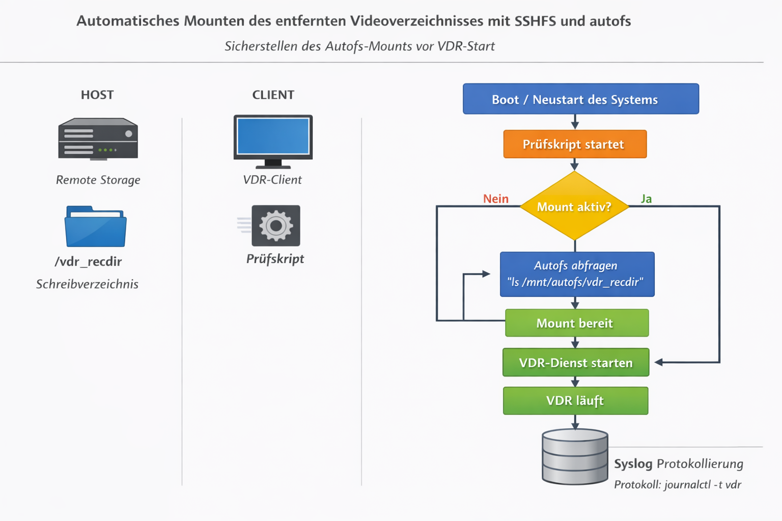 Um sicherzustellen, dass der Mount verfügbar ist, bevor VDR startet, kann ein Hilfsskript eingesetzt werden. Dieses prüft wiederholt, ob der Mount aktiv ist, und löst bei Bedarf den Zugriff aus, um Autofs zum Mounten zu bewegen. Sobald der Mount bereitsteht, wird der VDR‑Dienst gestartet oder neu gestartet. Alle Statusmeldungen werden über Syslog protokolliert, sodass sie in den VDR‑Logs (journalctl -t vdr) sichtbar sind.