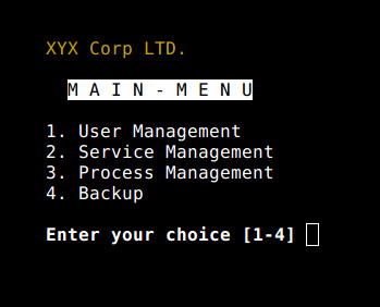 1 2 3 4 5 6 7 8 9 10 11 12 13 14 15 16 17 18 19 20 21 22 23 24 25 26 27 | #!/bin/bash tput clear # clear the screen tput cup 3 15 # Move cursor to screen location X,Y (top left is 0,0) tput setaf 3 # Set a foreground colour using ANSI escape echo "XYX Corp LTD." tput sgr0 tput cup 5 17 tput rev # Set reverse video mode echo "M A I N - M E N U" tput sgr0 tput cup 7 15; echo "1. User Management" tput cup 8 15; echo "2. Service Management" tput cup 9 15; echo "3. Process Management" tput cup 10 15; echo "4. Backup" tput bold # Set bold mode tput cup 12 15 read -p "Enter your choice [1-4] " choice tput clear tput sgr0 tput rc |